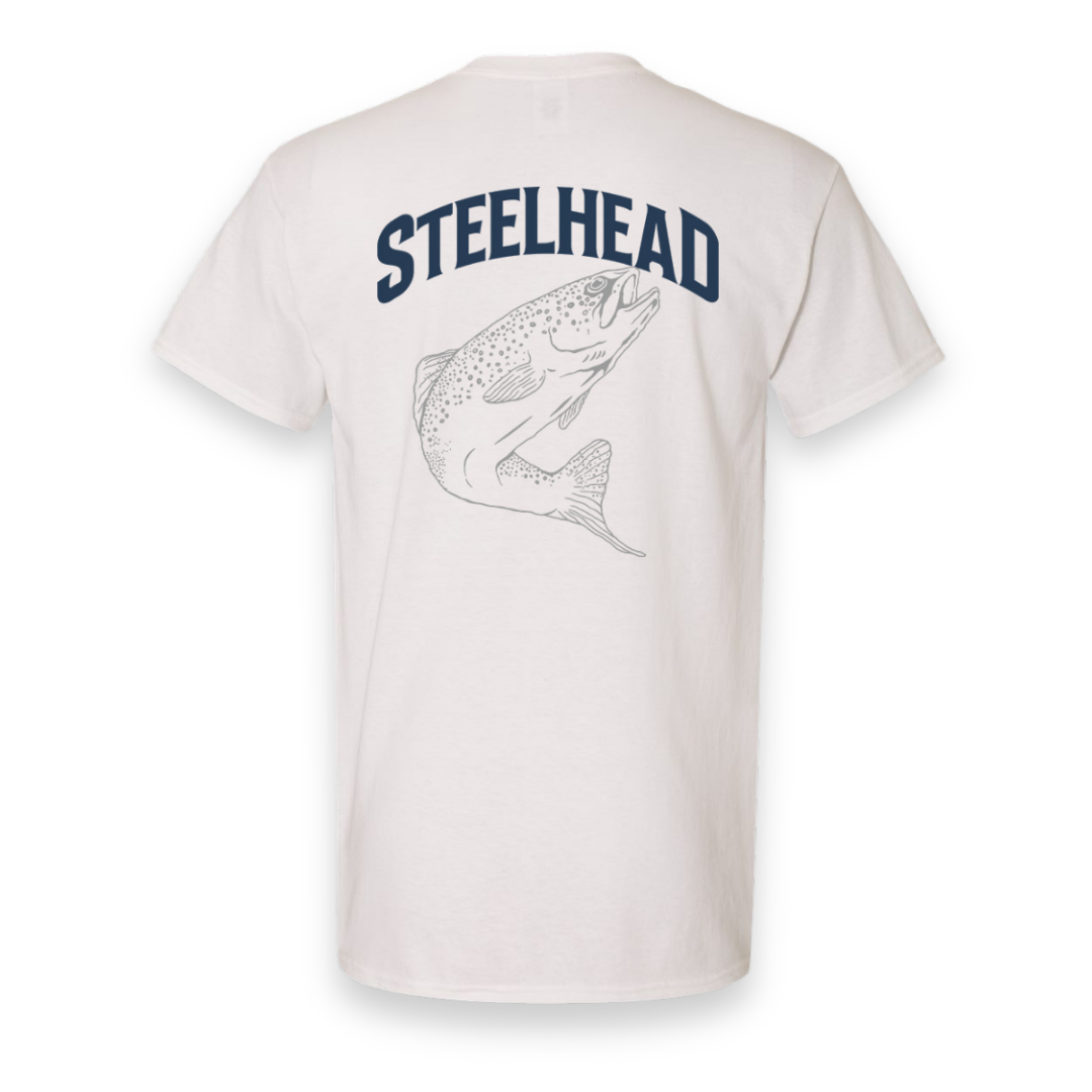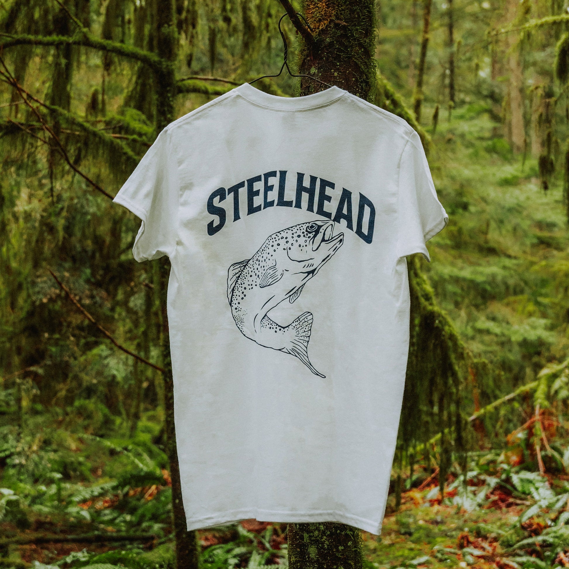 Featuring bold Steelhead branding and a detailed steelhead trout illustration on the back.